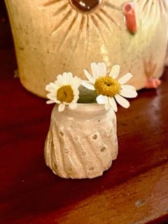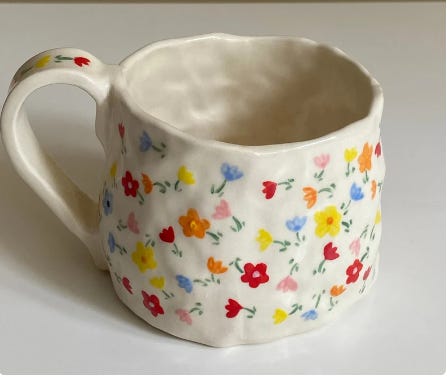 First, treasures. I’ve been trying to enjoy more tea, as a mindfulness practice. There are some great resources on the Sipsby site if you’d like to know more. And that has led to being mildly obsessed with hand painted mugs with tiny little flowers. Like this one on Etsy. It’s also possible my nascent pottery career is leading that way.